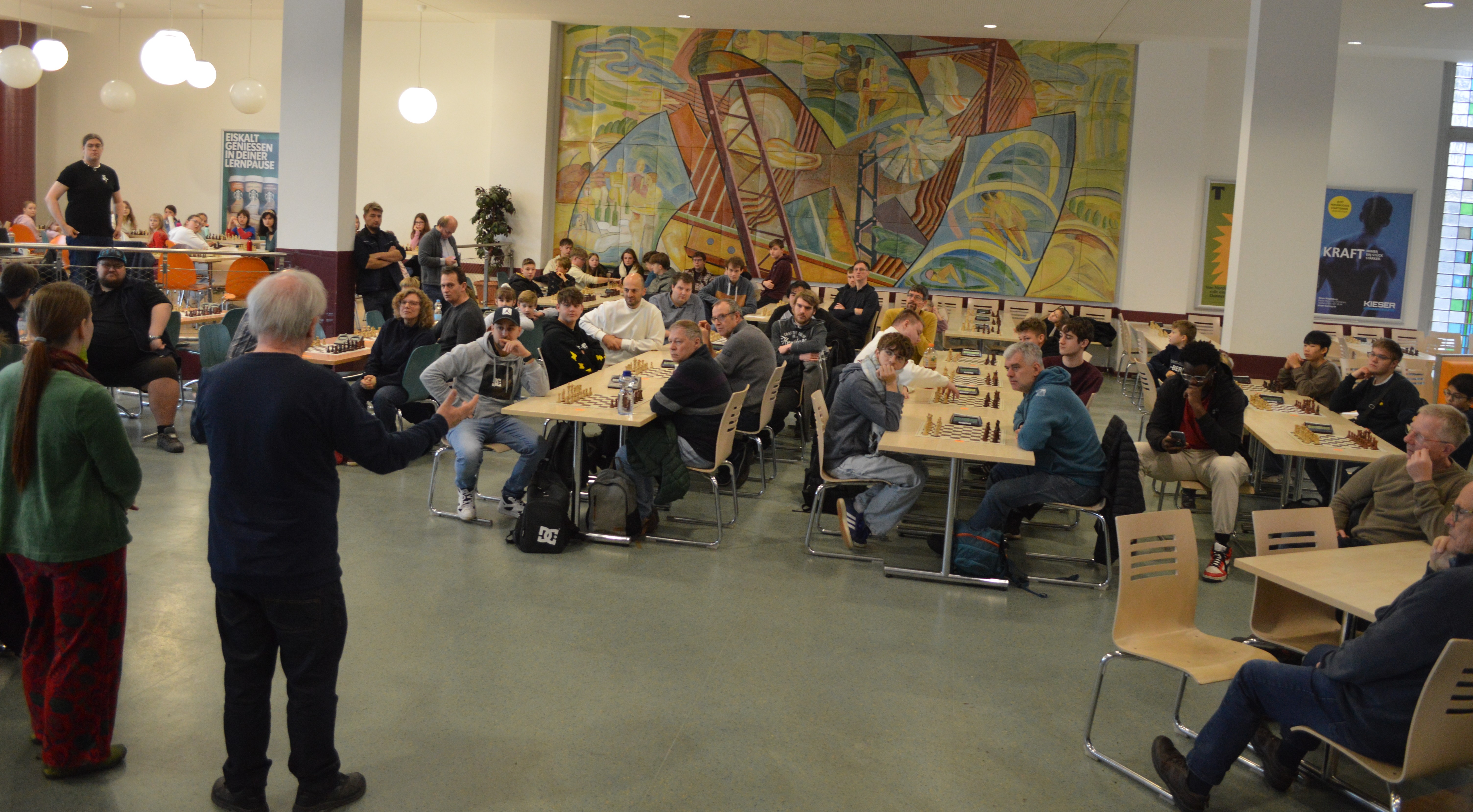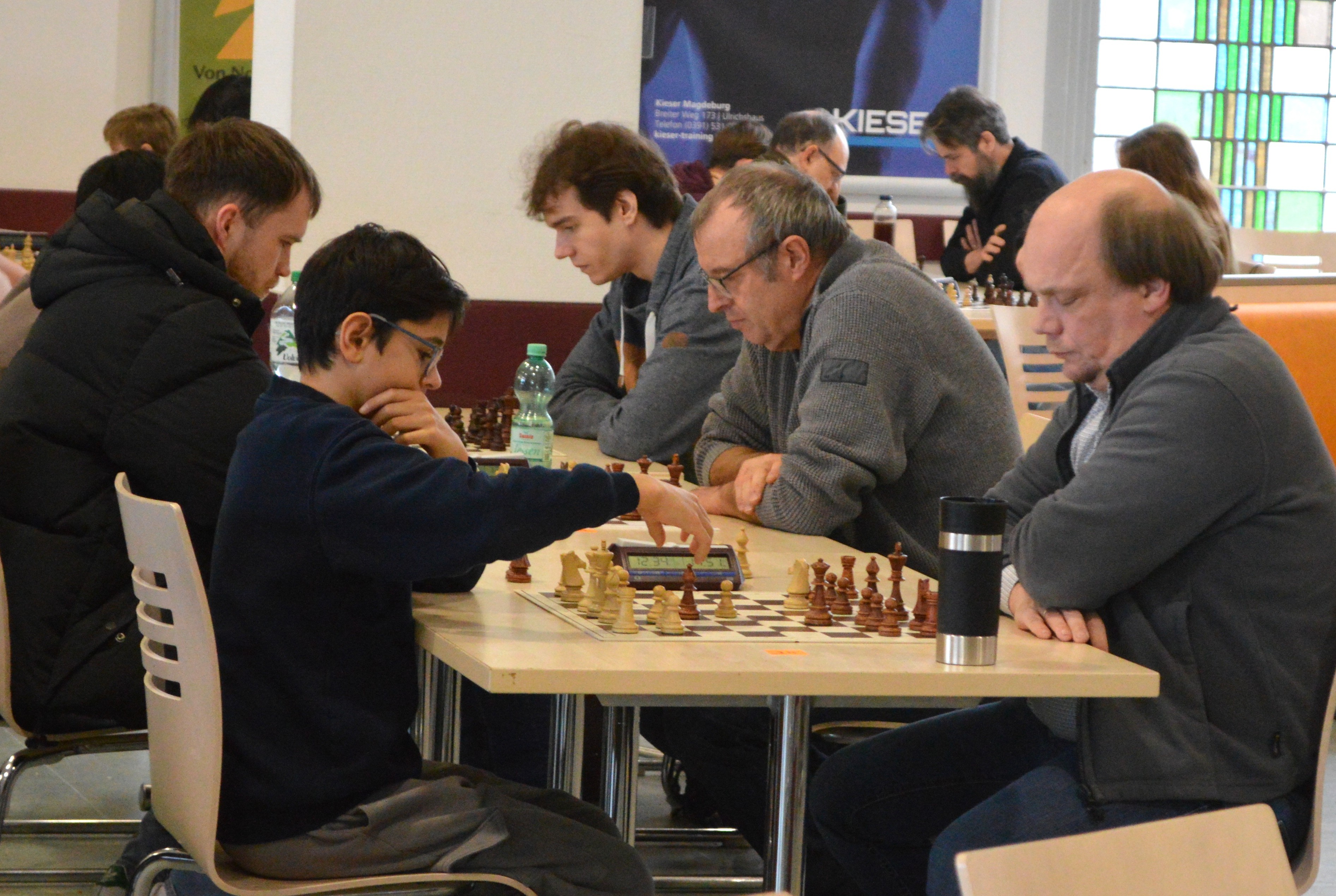 Auf den Tischen genau ausgerichtet liegen die Spielbretter und neben jedem Brett steht eine Schachuhr, dazwischen Schachspieler und Schachspielerinnen im Alter von 5 bis 83 Jahre und dazu die Turnierleitung und ehrenamtliche Helfer, die einen reichhaltigen Imbiss-Stand betreuen. Gleich wird das Startsignal für die 3 Turniergruppen unter dem Titel 19. Schnellschach-Neustadt-Open Magdeburg gegeben. Der Wettkampf am 30. November findet in der unteren Mensa der Otto-von-Guericke-Universität statt, organisiert von der Abteilung Schach/GO des USC Magdeburg e.V. und dem SV Rochade 96 Magdeburg mit Unterstützung durch das Studentenwerk Magdeburg. Zu der ganztägigen Veranstaltung an dem Sonntag gehören unter anderem auch der 16. Universitäts-Jugend-Cup und ein Mädchenturnier.