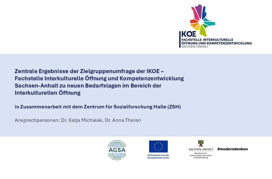 In Kooperation mit dem Zentrum für Sozialforschung Halle (ZSH) hat das IKOE-Projekt der Auslandsgesellschaft Sachsen-Anhalt e.V. 230 Fachkräfte aus Verwaltung, Schulen und zivilgesellschaftlichen Organisationen zu ihren Erfahrungen und Bedarfen im Kontext interkultureller Öffnung befragt. Dabei wurden von Juni bis August 2025 alle Zielgruppen außerdem zu ihren Erfahrungen mit systemspezifischen Diskriminierungsformen befragt. In einer Präsentation haben wir die wichtigsten Aussagen zusammengefasst (hier zum Download).